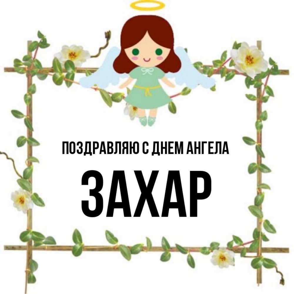 Открытка Поздравляю с днем Ангела Захар. Ангел сидит на рамочке из цветов. Ангел с нимбом