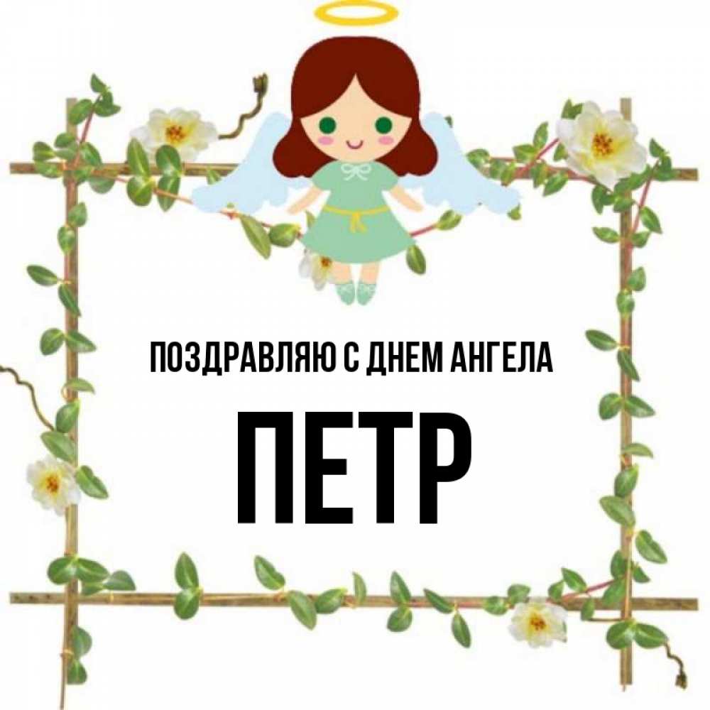 Открытка Поздравляю с днем Ангела Петр. Ангел сидит на рамочке из цветов. Ангел с нимбом