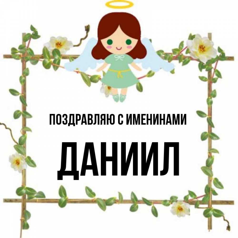 Открытка Поздравляю с именинами Даниил. Ангел сидит на рамочке из цветов. Ангел с нимбом