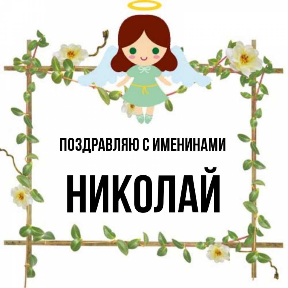 Открытка Поздравляю с именинами Николай. Ангел сидит на рамочке из цветов. Ангел с нимбом