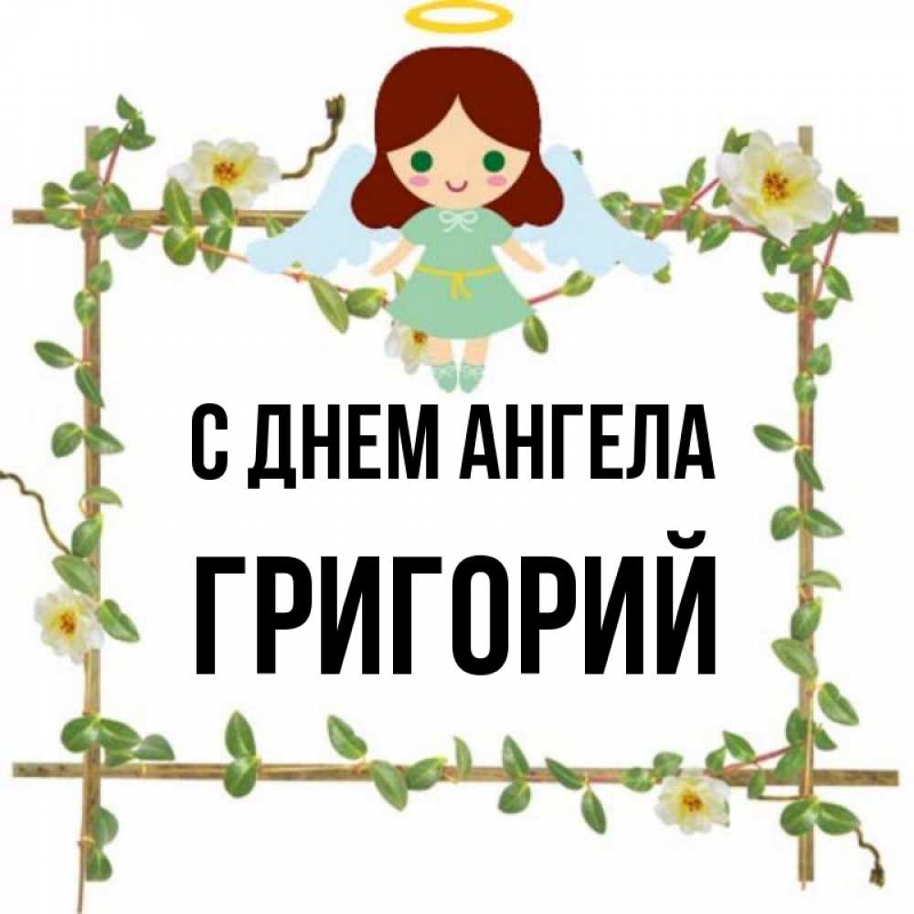Открытка С днем Ангела Григорий. Ангел сидит на рамочке из цветов. Ангел с нимбом
