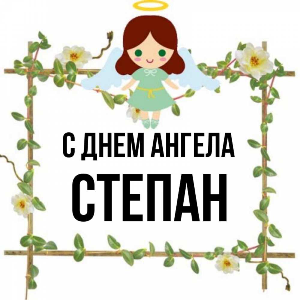 Открытка С днем Ангела Степан. Ангел сидит на рамочке из цветов. Ангел с нимбом