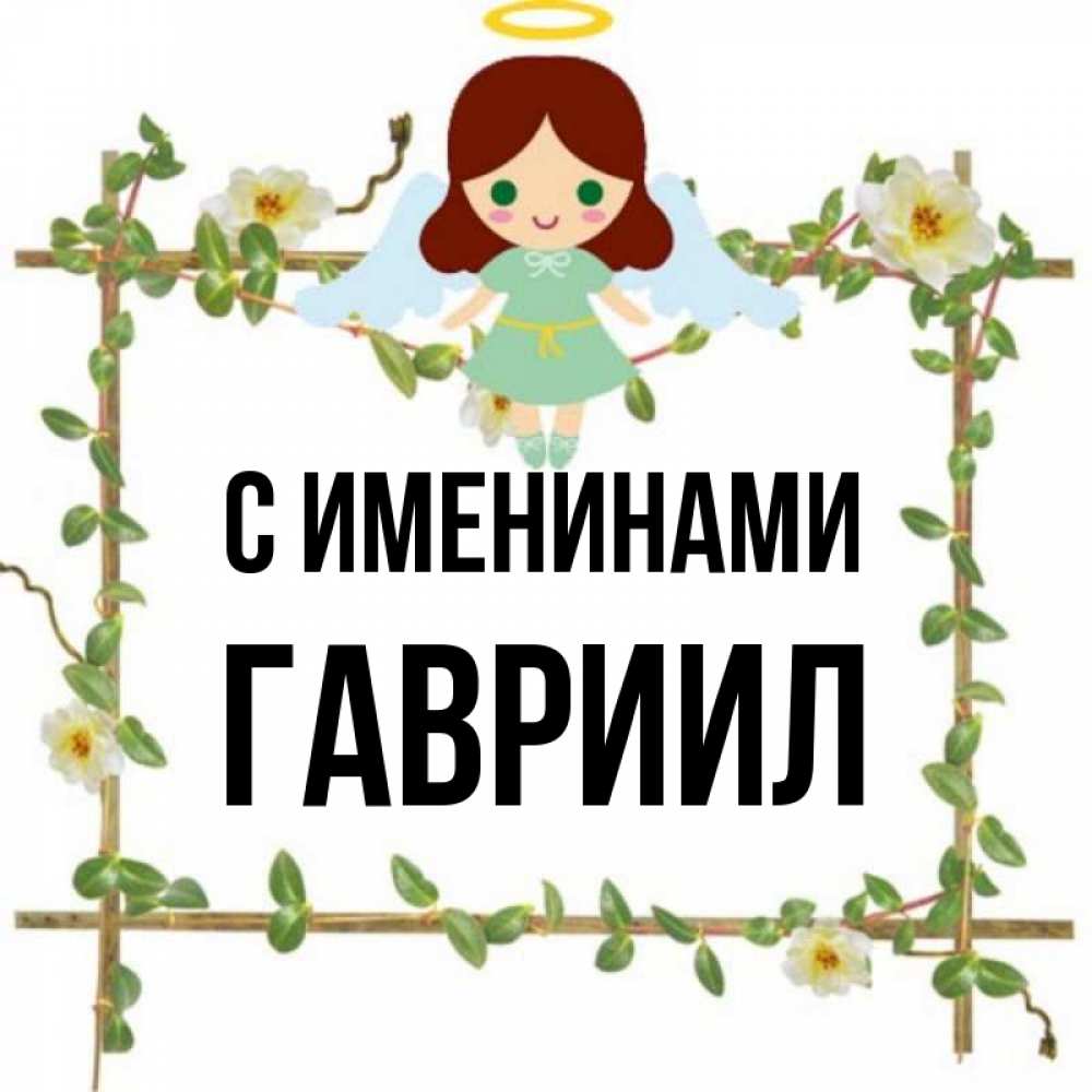 Открытка С именинами Гавриил. Ангел сидит на рамочке из цветов. Ангел с нимбом