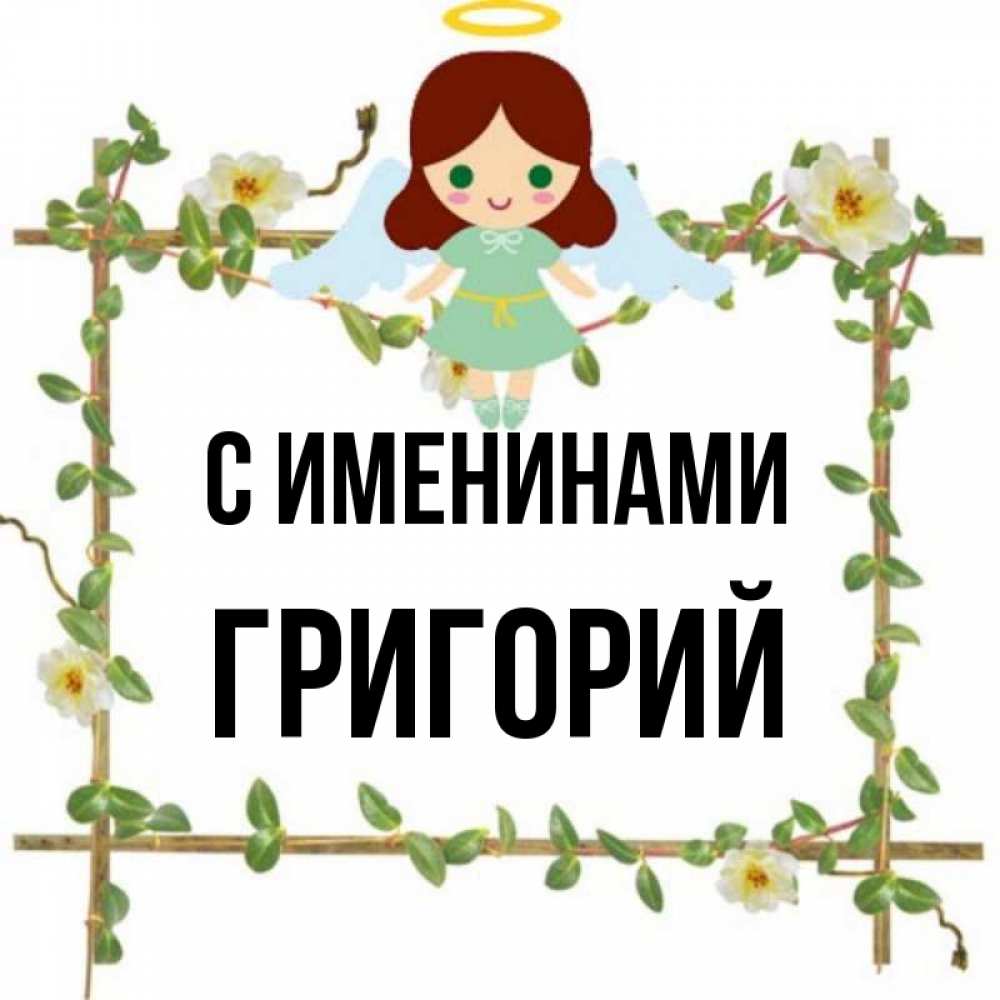 Открытка С именинами Григорий. Ангел сидит на рамочке из цветов. Ангел с нимбом