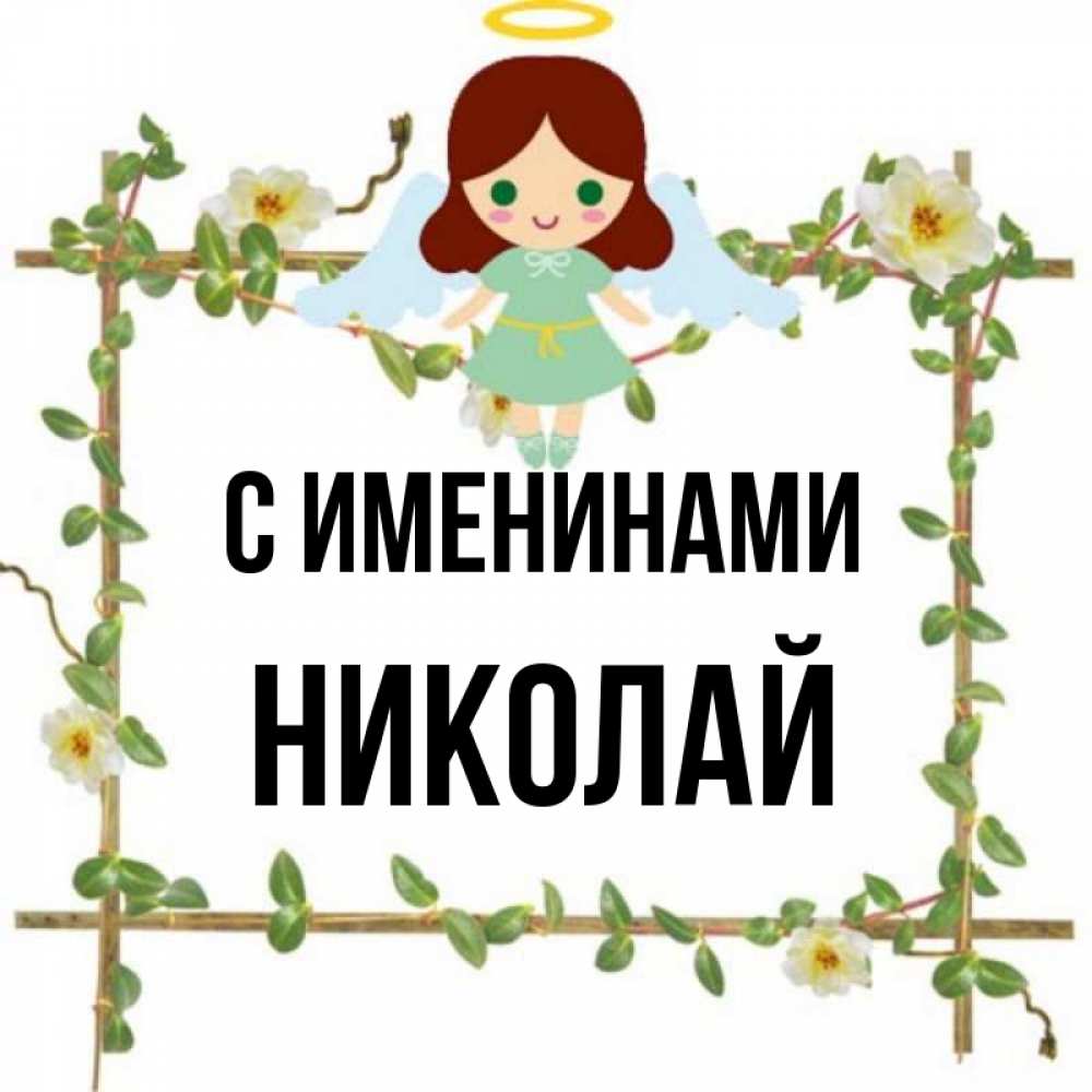 Открытка С именинами Николай. Ангел сидит на рамочке из цветов. Ангел с нимбом