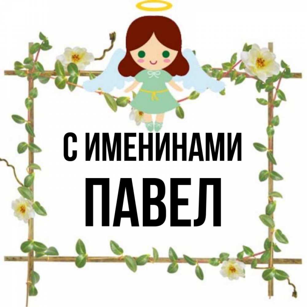Открытка С именинами Павел. Ангел сидит на рамочке из цветов. Ангел с нимбом