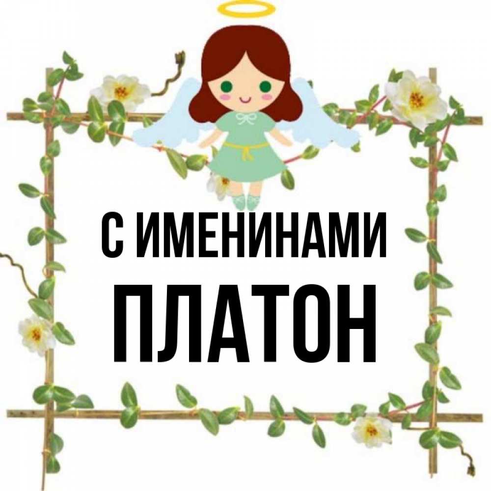 Открытка С именинами Платон. Ангел сидит на рамочке из цветов. Ангел с нимбом