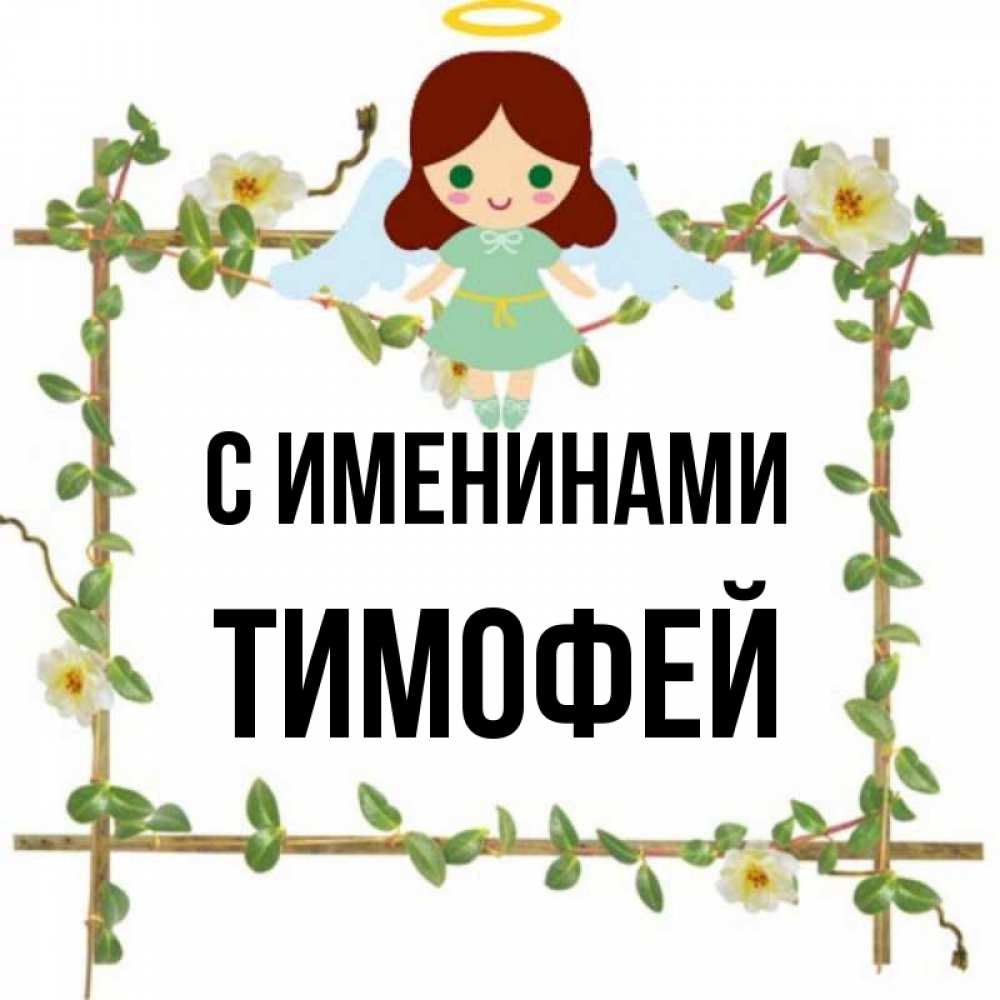 Открытка С именинами Тимофей. Ангел сидит на рамочке из цветов. Ангел с нимбом