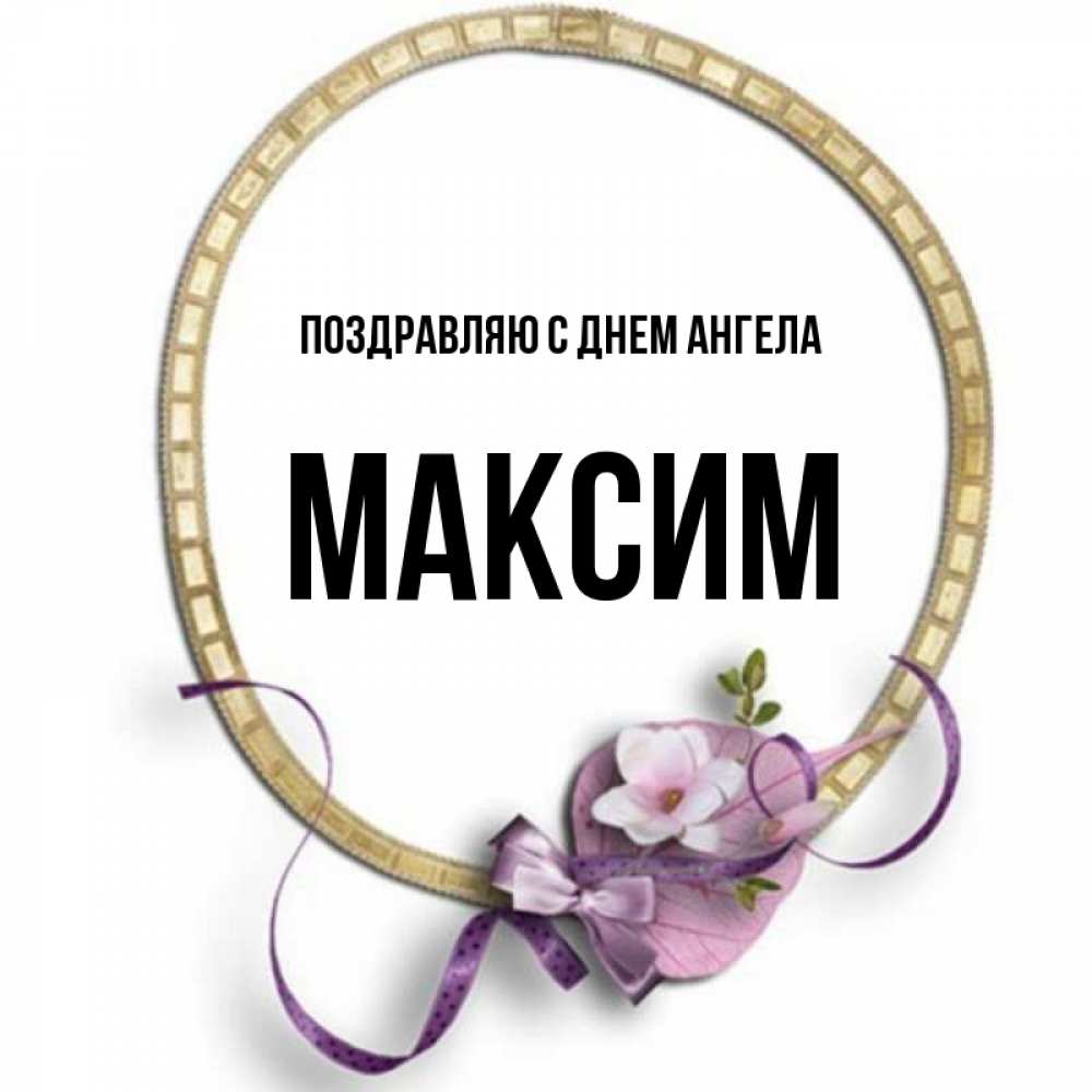 Открытка Поздравляю с днем Ангела Максим. Рамочка с белым цветком и сиреневыми илстьями. золотая рамочка