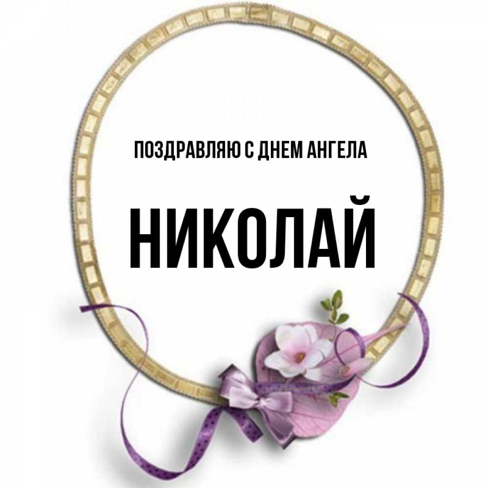 Открытка Поздравляю с днем Ангела Николай. Рамочка с белым цветком и сиреневыми илстьями. золотая рамочка
