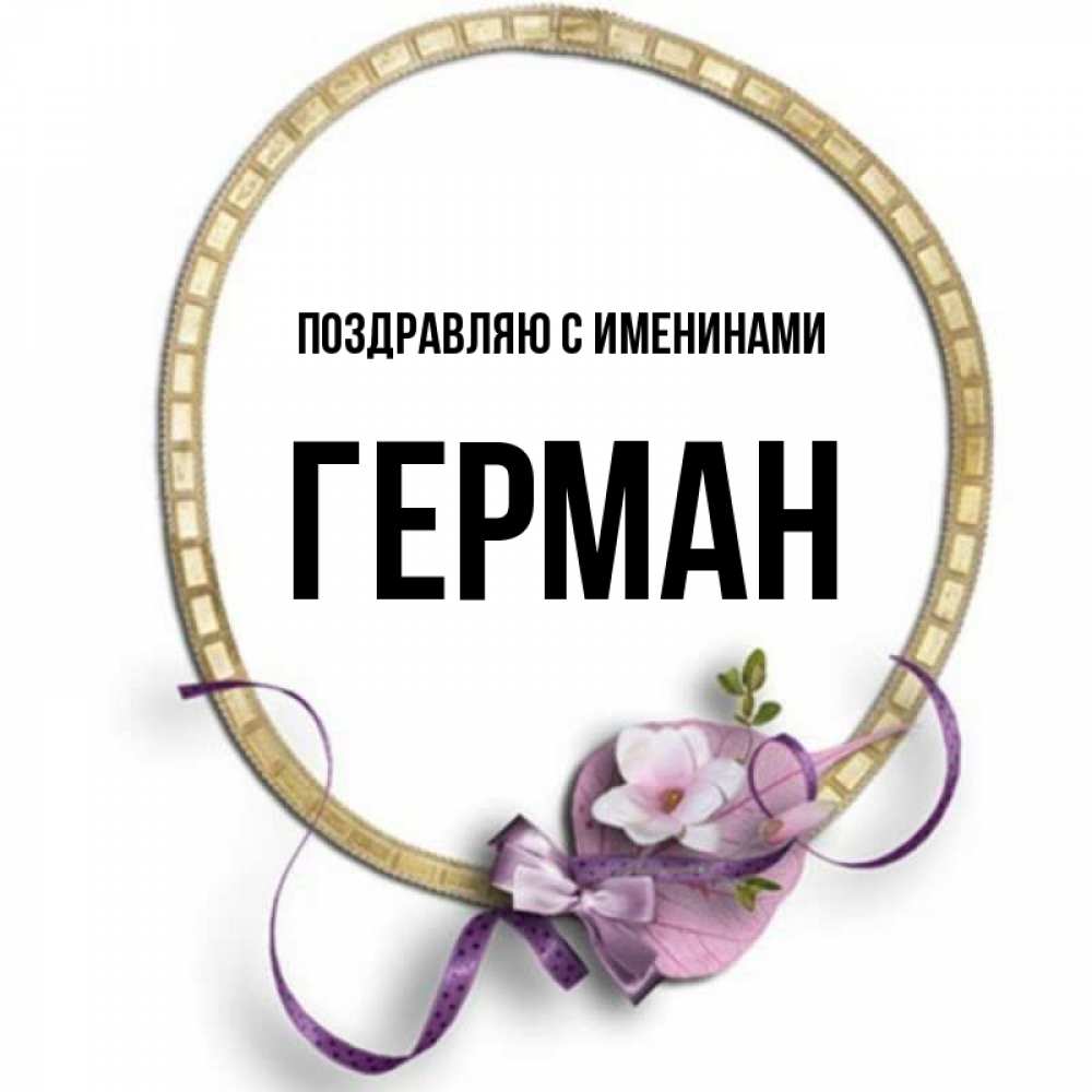 Открытка Поздравляю с именинами Герман. Рамочка с белым цветком и сиреневыми илстьями. золотая рамочка