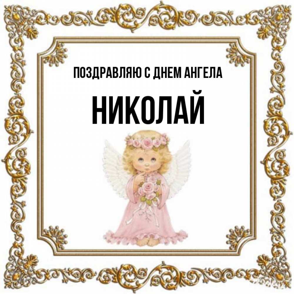 Открытка Поздравляю с днем Ангела Николай. милый ангел в рамочке из золота. девочка ангел с крыльями и цветами в розовом платье