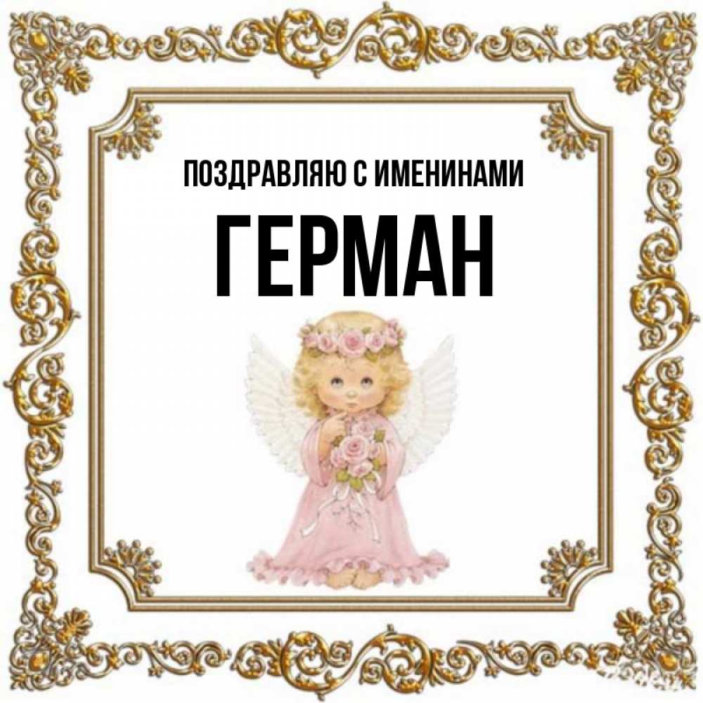 Открытка Поздравляю с именинами Герман. милый ангел в рамочке из золота. девочка ангел с крыльями и цветами в розовом платье