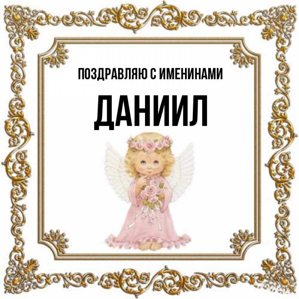 Открытка Поздравляю с именинами Даниил. милый ангел в рамочке из золота. девочка ангел с крыльями и цветами в розовом платье