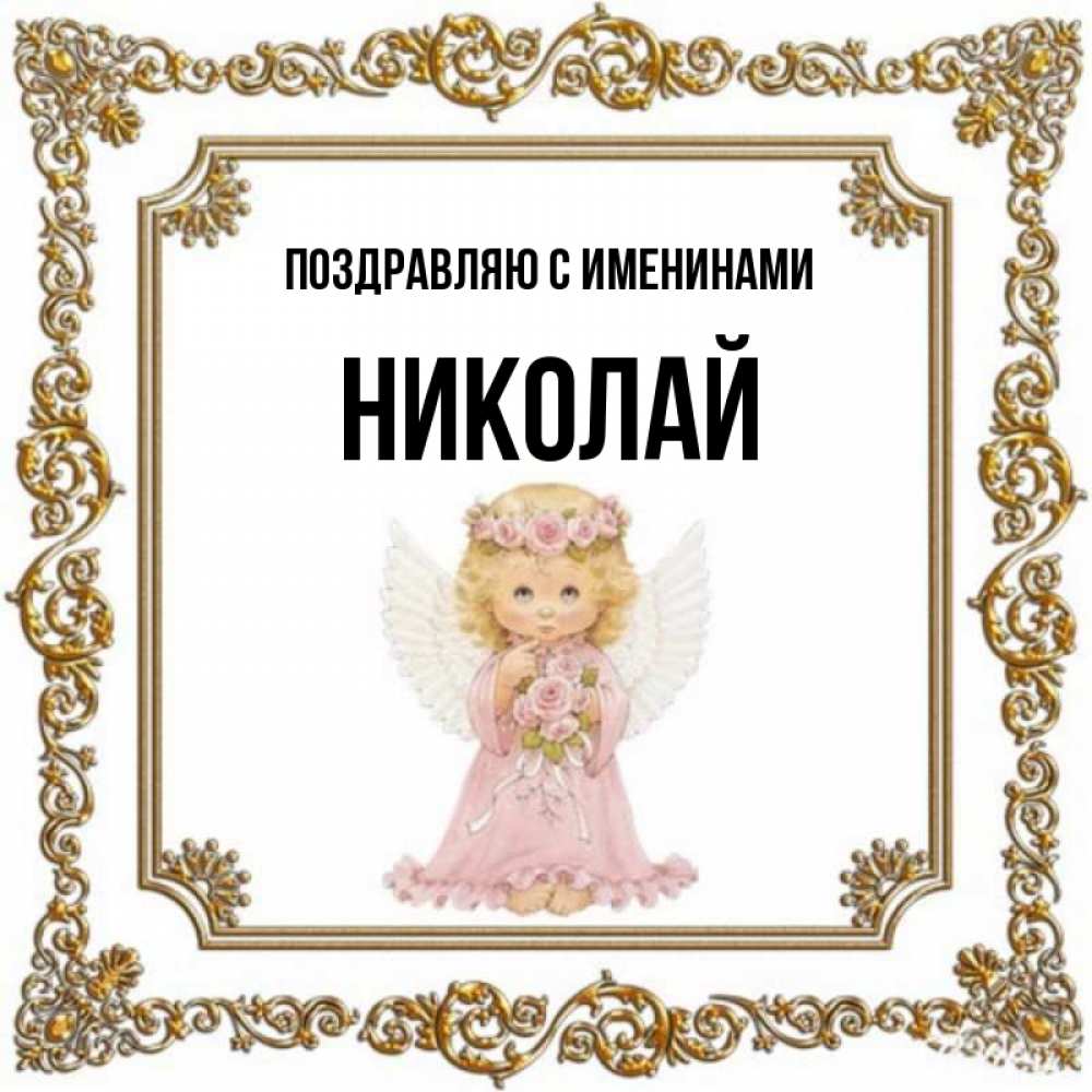 Открытка Поздравляю с именинами Николай. милый ангел в рамочке из золота. девочка ангел с крыльями и цветами в розовом платье