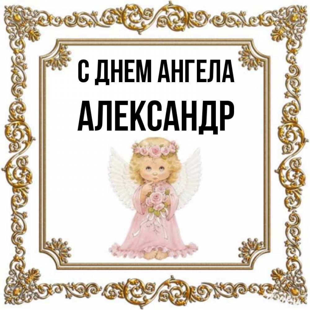 Открытка С днем Ангела Александр. милый ангел в рамочке из золота. девочка ангел с крыльями и цветами в розовом платье