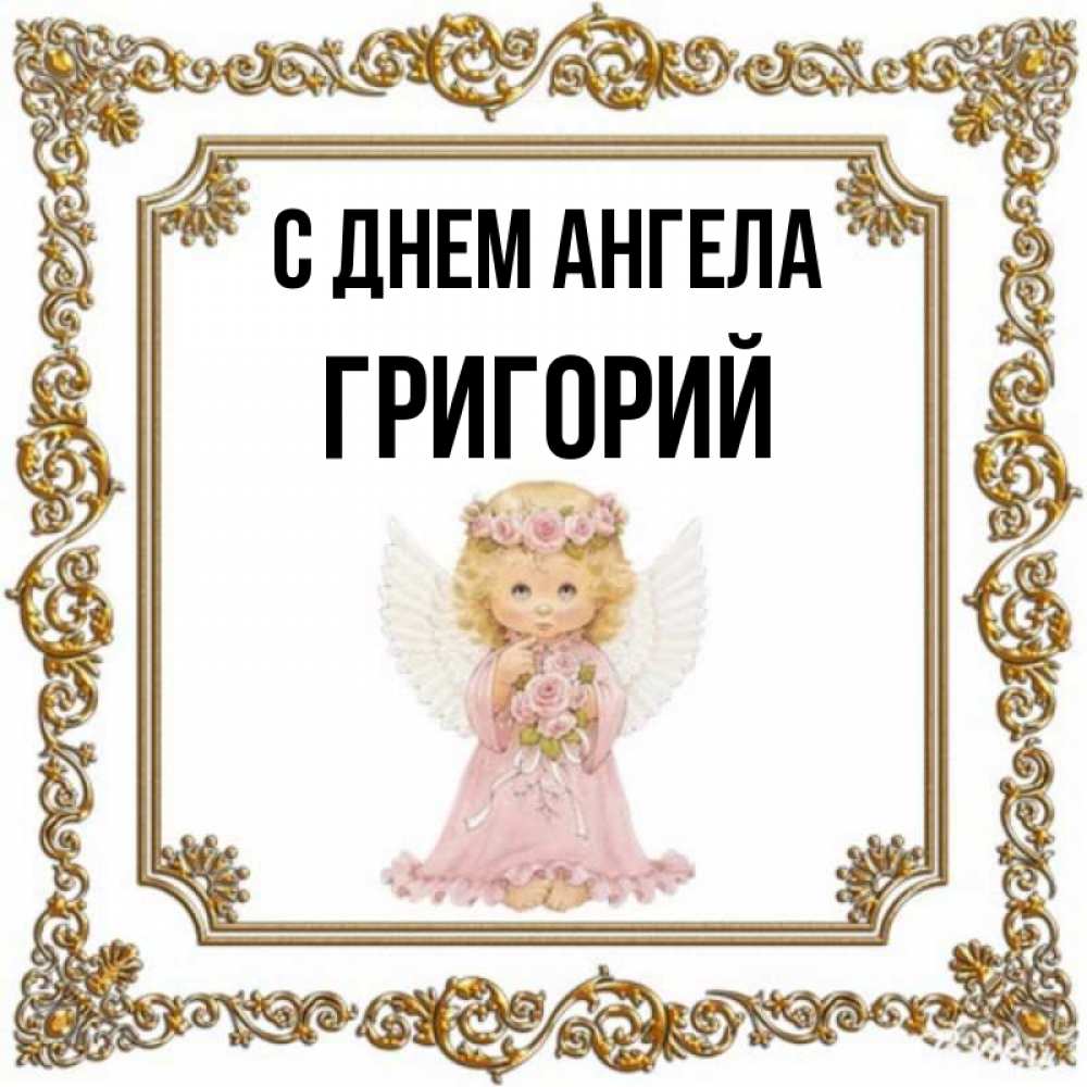Открытка С днем Ангела Григорий. милый ангел в рамочке из золота. девочка ангел с крыльями и цветами в розовом платье