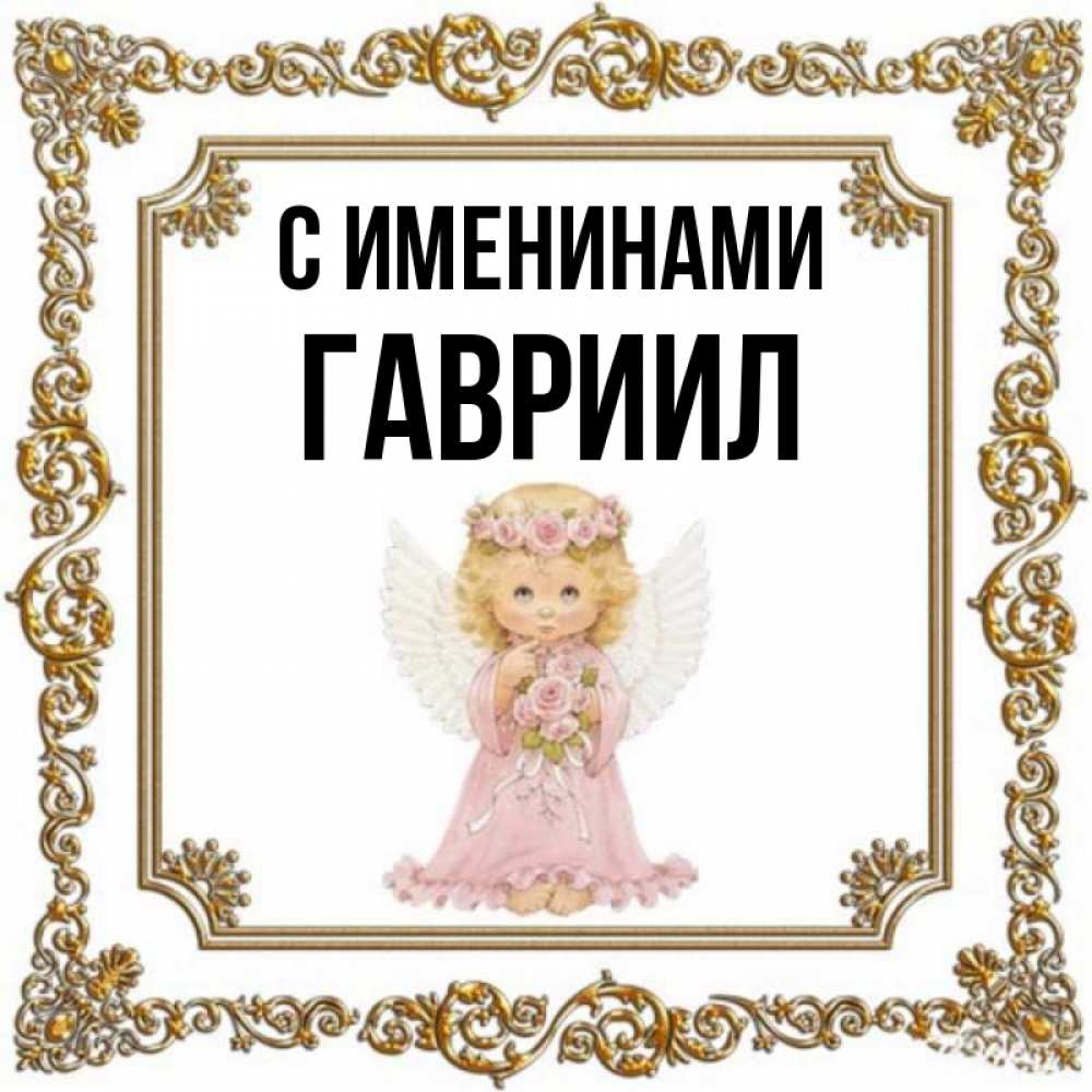 Открытка С именинами Гавриил. милый ангел в рамочке из золота. девочка ангел с крыльями и цветами в розовом платье
