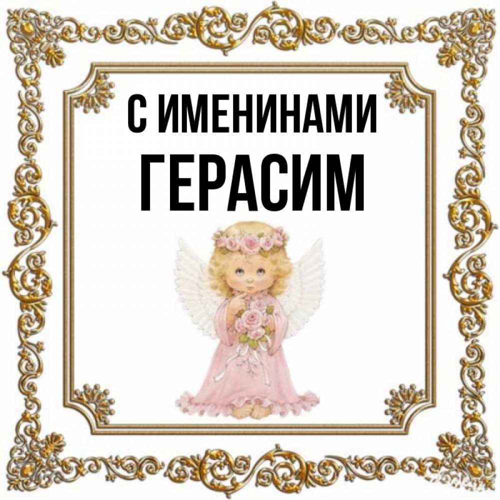 Открытка С именинами Герасим. милый ангел в рамочке из золота. девочка ангел с крыльями и цветами в розовом платье