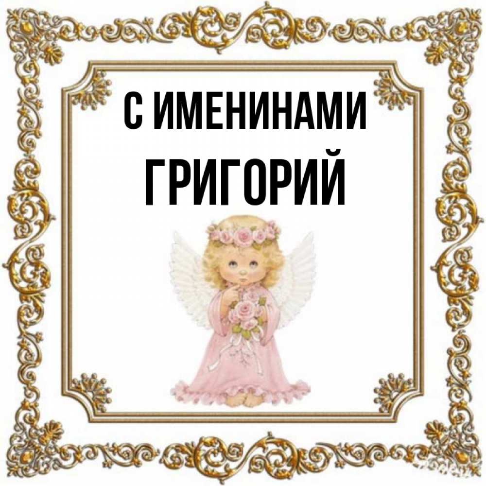 Открытка С именинами Григорий. милый ангел в рамочке из золота. девочка ангел с крыльями и цветами в розовом платье
