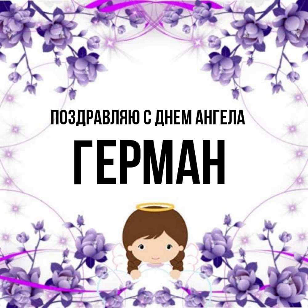 Открытка Поздравляю с днем Ангела Герман. Ангел с нимбом и фиолетовые цветы. с именинами в рамочке