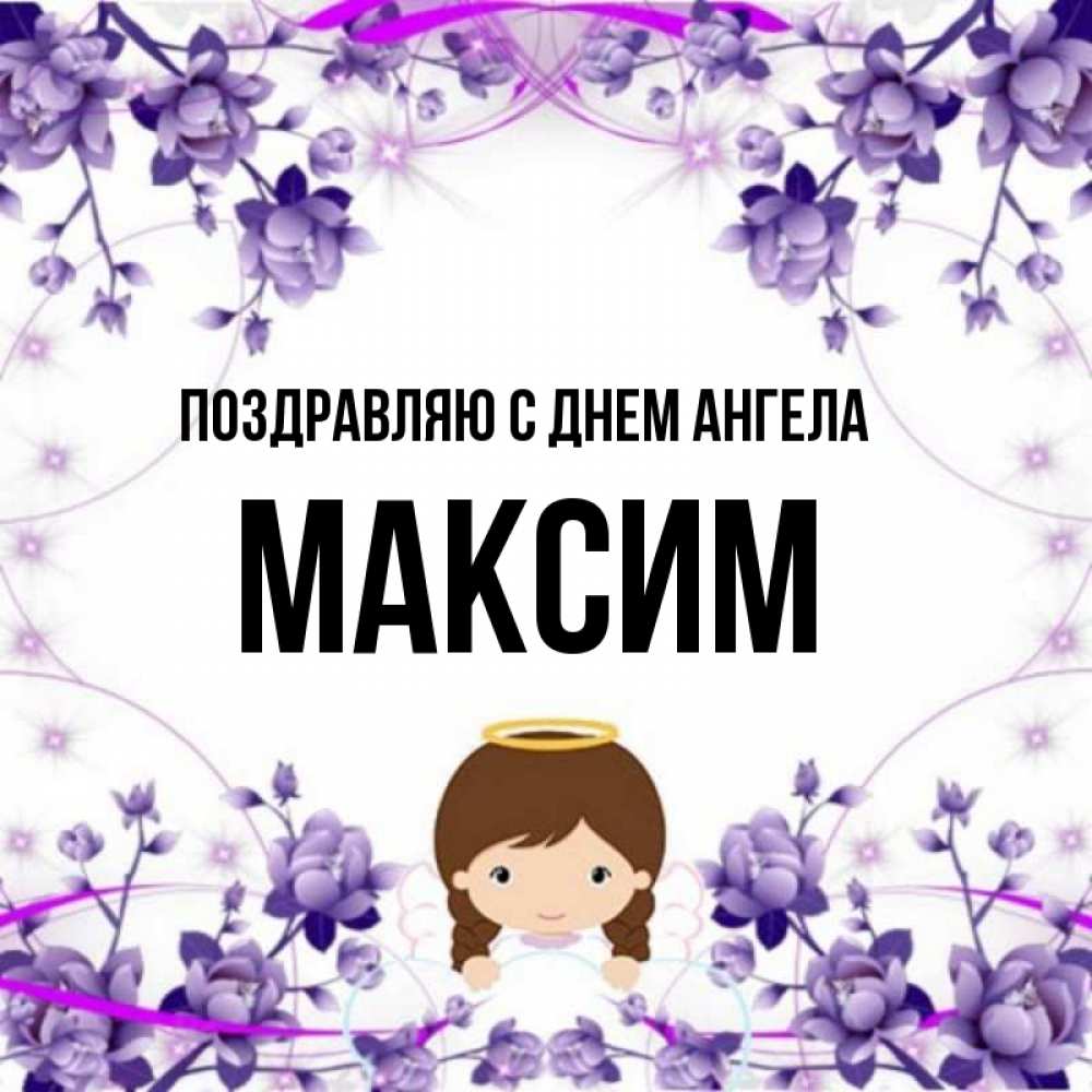 Открытка Поздравляю с днем Ангела Максим. Ангел с нимбом и фиолетовые цветы. с именинами в рамочке