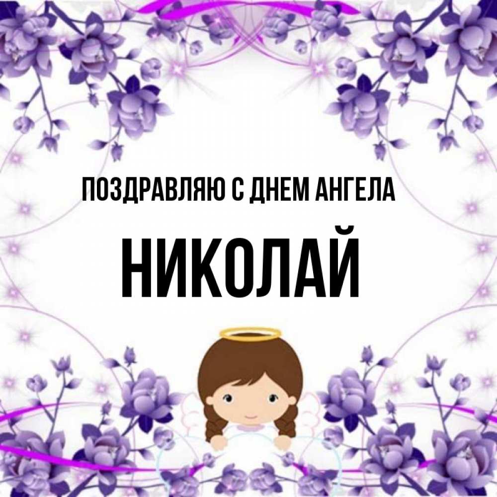 Открытка Поздравляю с днем Ангела Николай. Ангел с нимбом и фиолетовые цветы. с именинами в рамочке