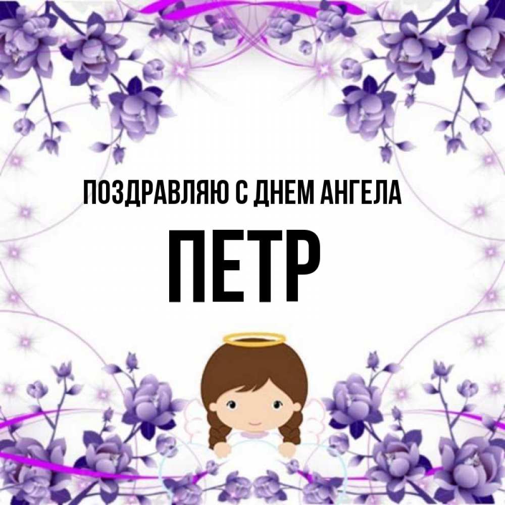 Открытка Поздравляю с днем Ангела Петр. Ангел с нимбом и фиолетовые цветы. с именинами в рамочке