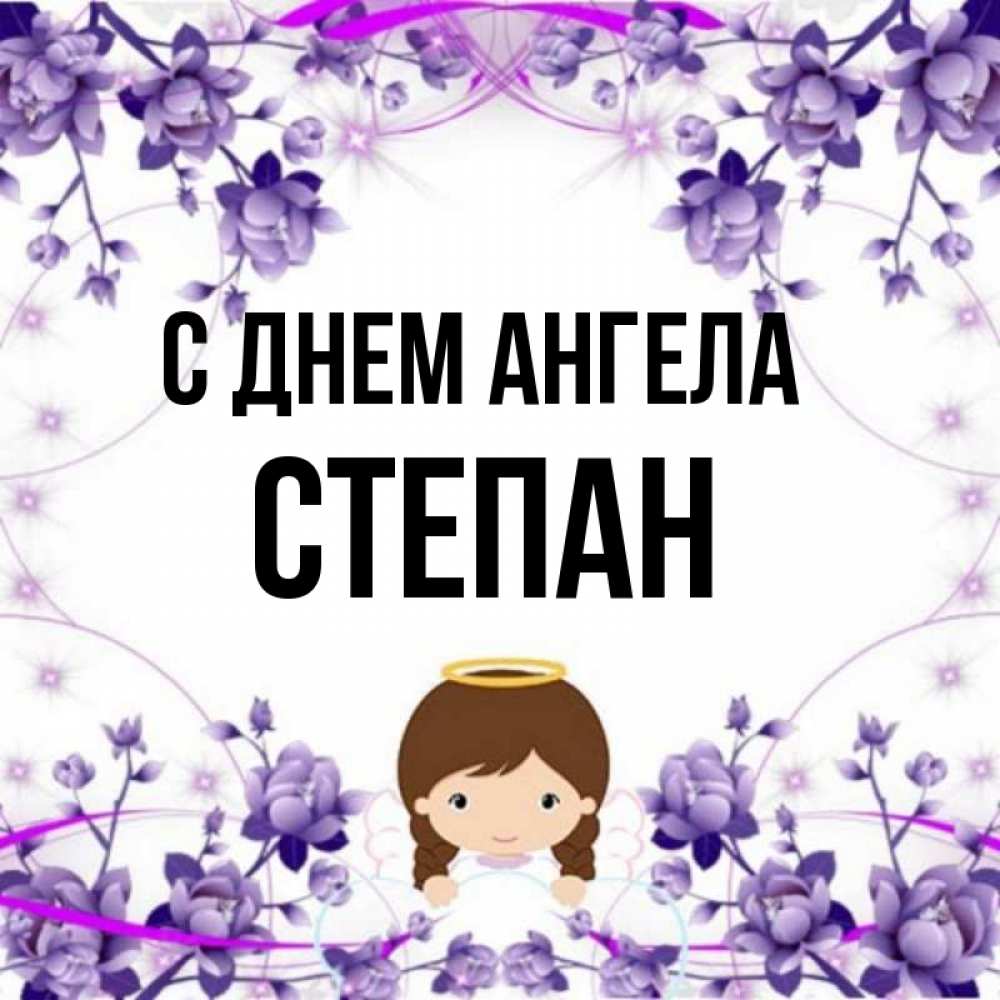 Открытка С днем Ангела Степан. Ангел с нимбом и фиолетовые цветы. с именинами в рамочке