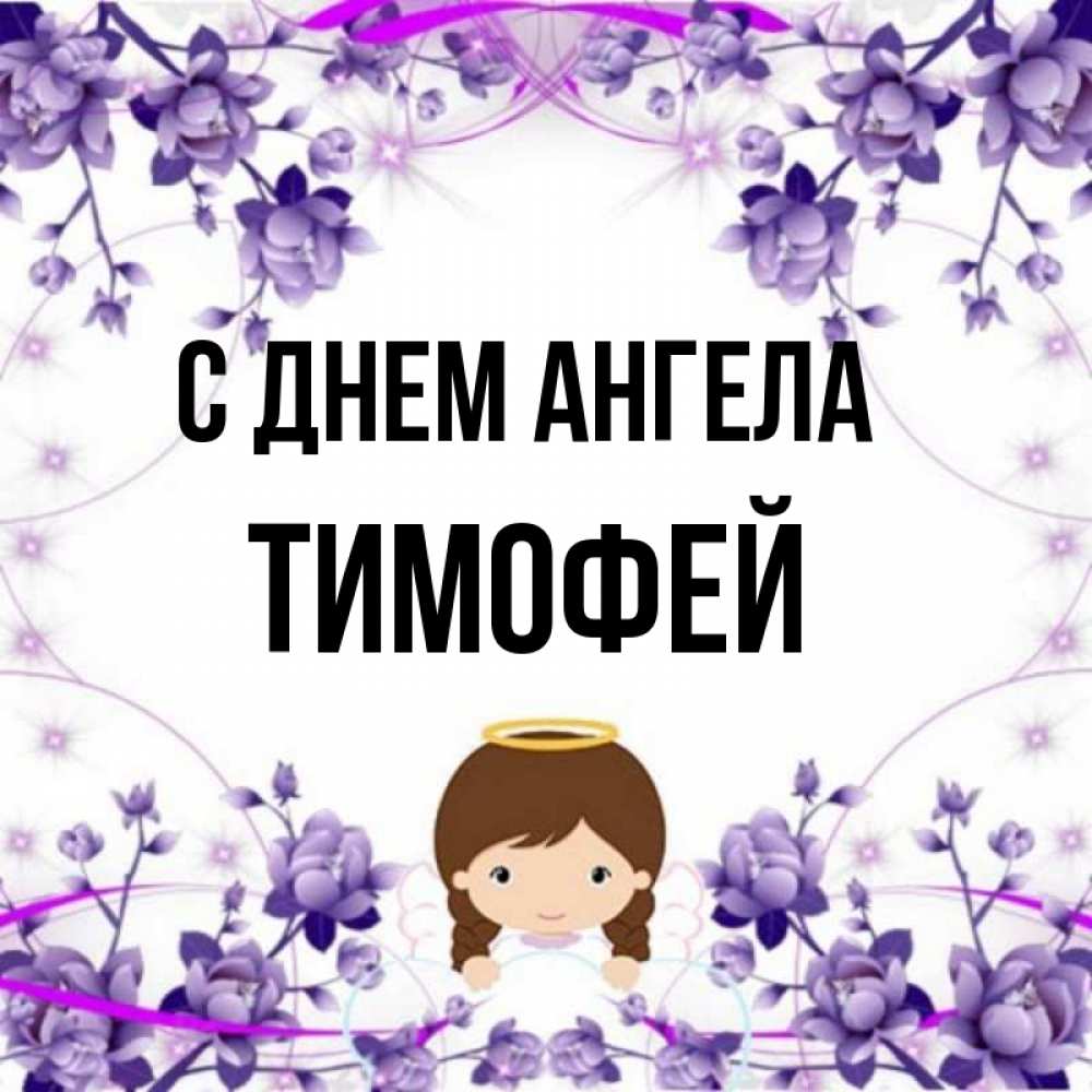 Открытка С днем Ангела Тимофей. Ангел с нимбом и фиолетовые цветы. с именинами в рамочке