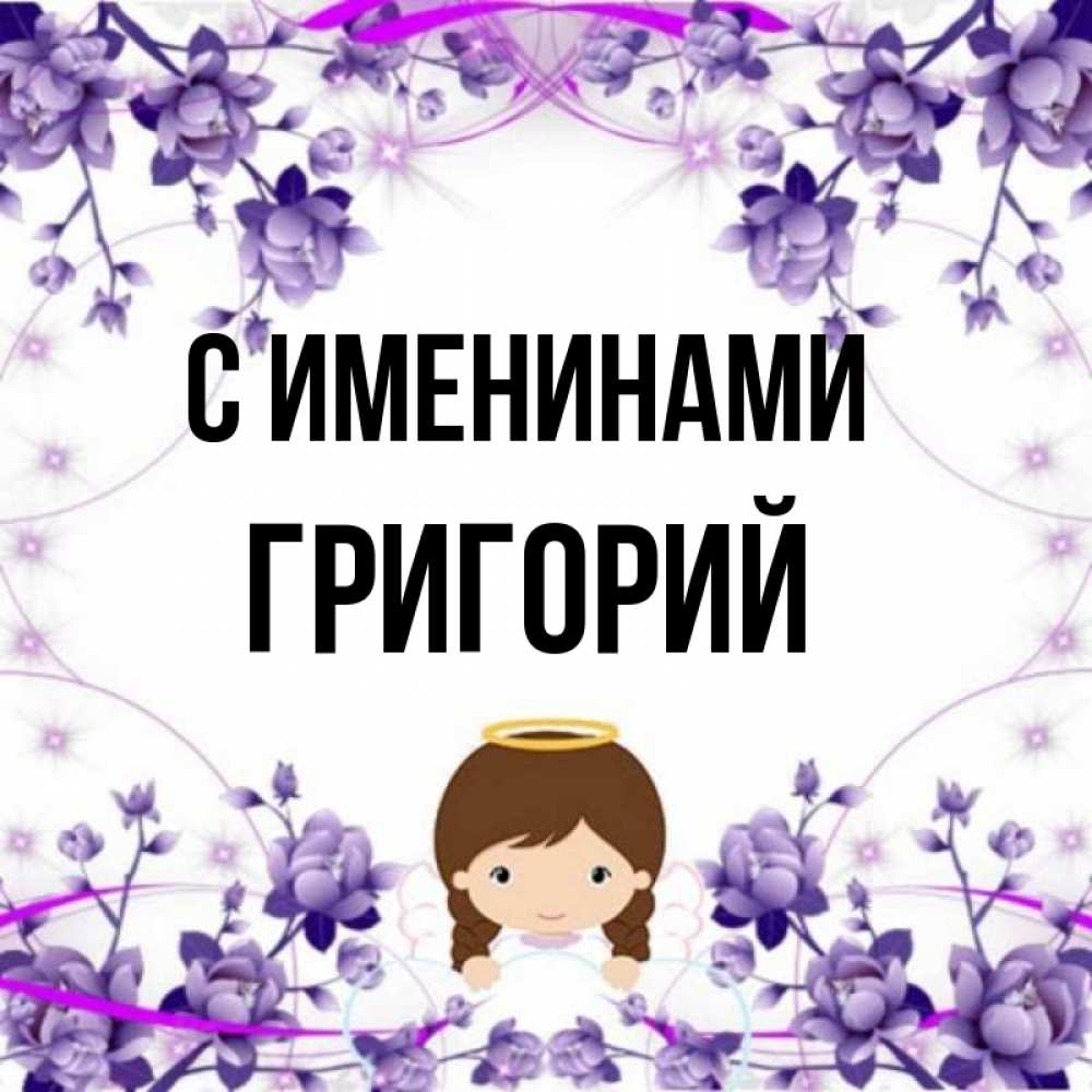 Открытка С именинами Григорий. Ангел с нимбом и фиолетовые цветы. с именинами в рамочке