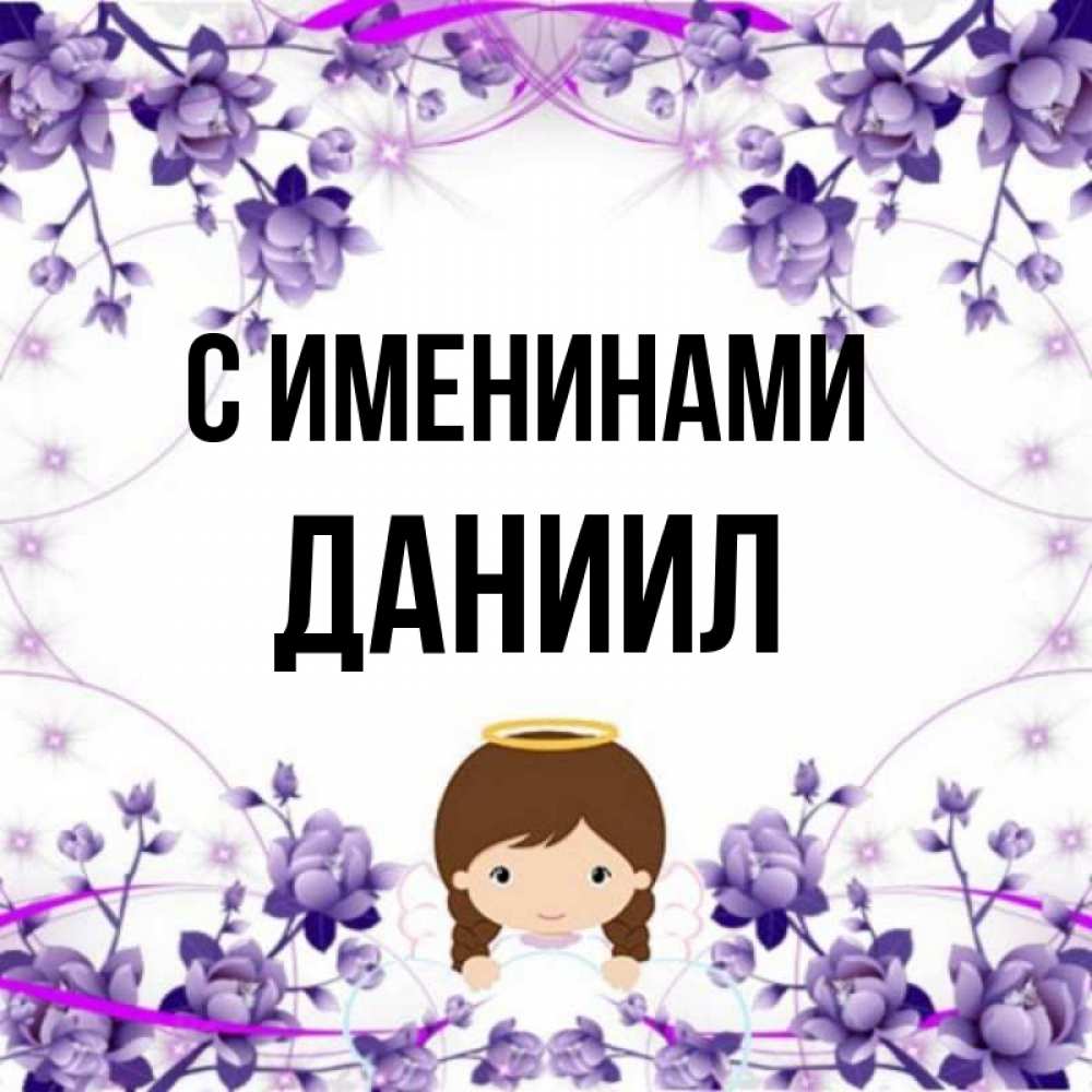 Открытка С именинами Даниил. Ангел с нимбом и фиолетовые цветы. с именинами в рамочке