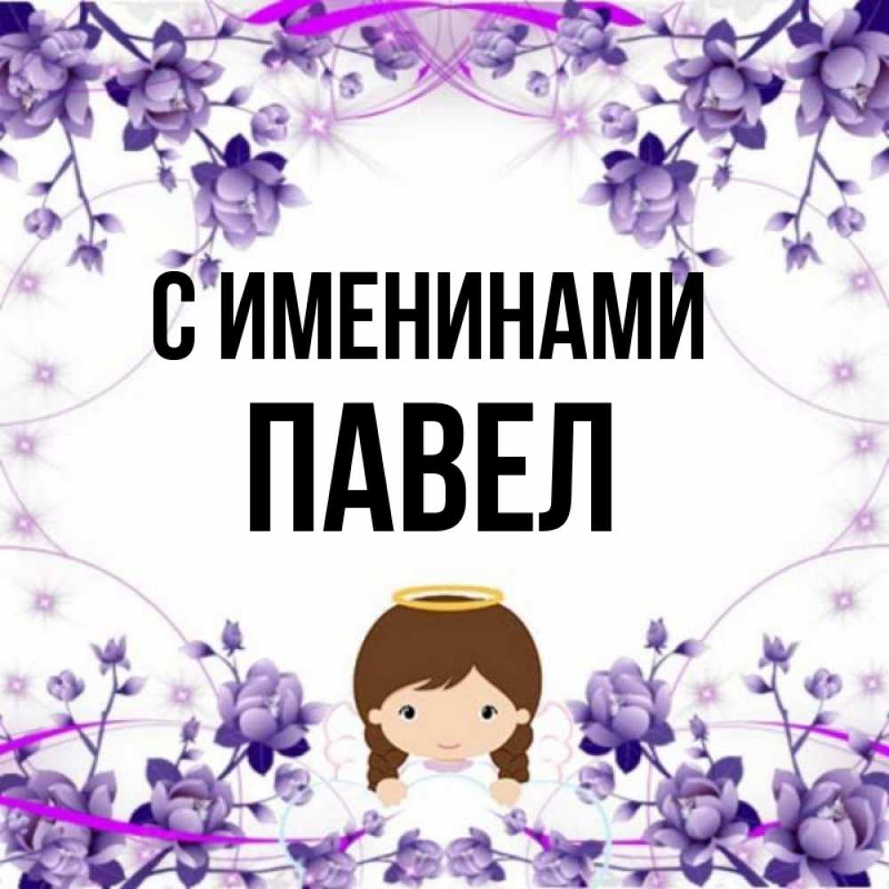 Открытка С именинами Павел. Ангел с нимбом и фиолетовые цветы. с именинами в рамочке