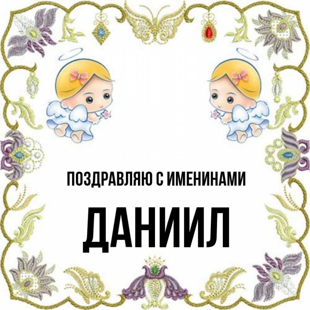 Открытка Поздравляю с именинами Даниил. с днем ангела драгоценная рамочка. маленькие ангелы с крылышками