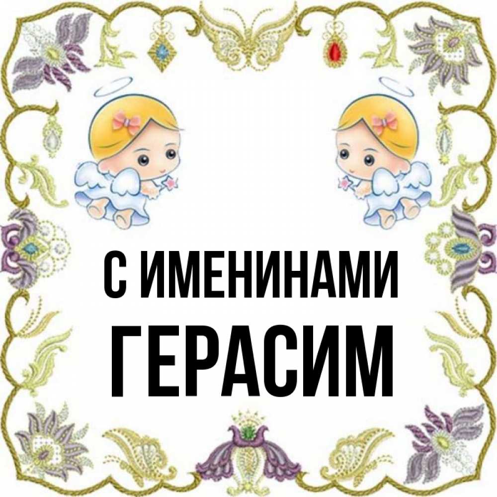 Открытка С именинами Герасим. с днем ангела драгоценная рамочка. маленькие ангелы с крылышками