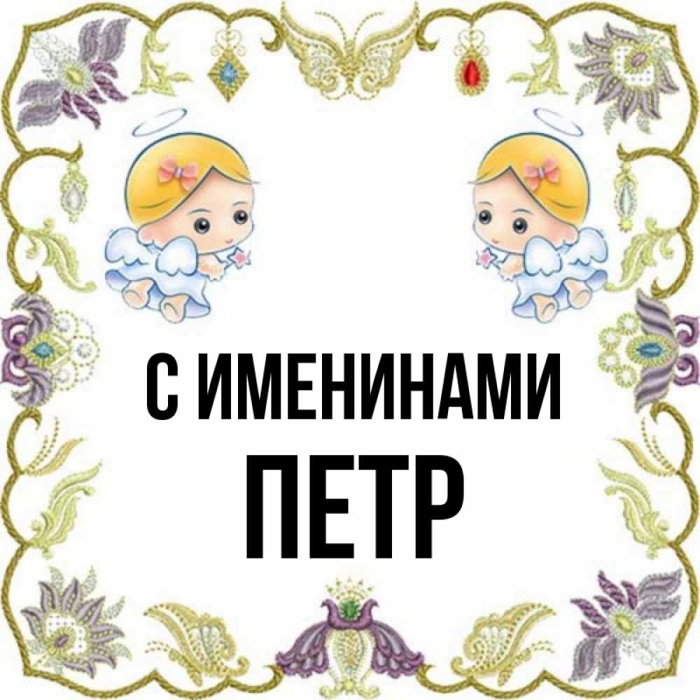 Открытка С именинами Петр. с днем ангела драгоценная рамочка. маленькие ангелы с крылышками
