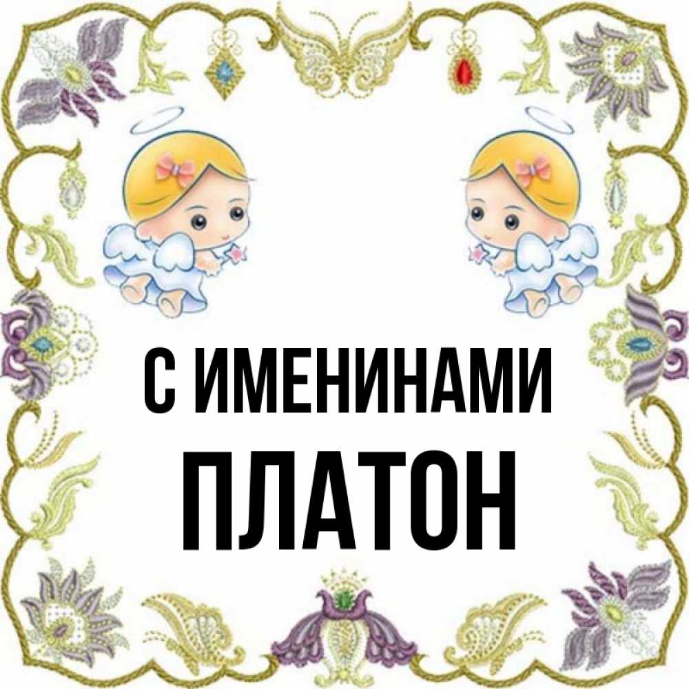 Открытка С именинами Платон. с днем ангела драгоценная рамочка. маленькие ангелы с крылышками