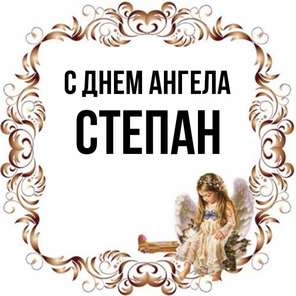 Открытка С днем Ангела Степан. ангел сидит на рамочке . рамочка из перьев и ангелочек