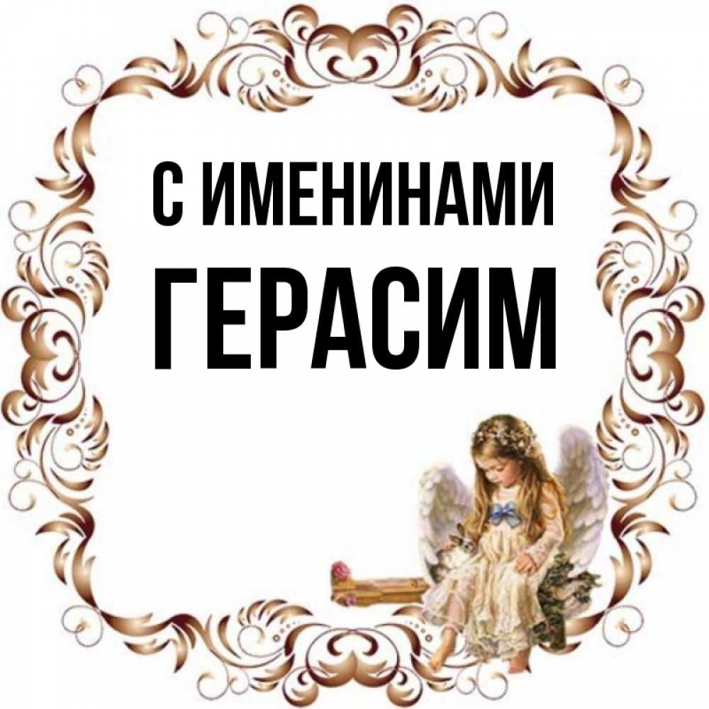 Открытка С именинами Герасим. ангел сидит на рамочке . рамочка из перьев и ангелочек