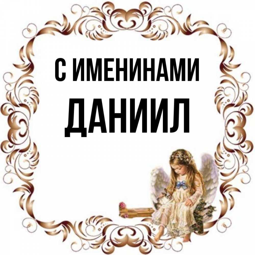 Открытка С именинами Даниил. ангел сидит на рамочке . рамочка из перьев и ангелочек