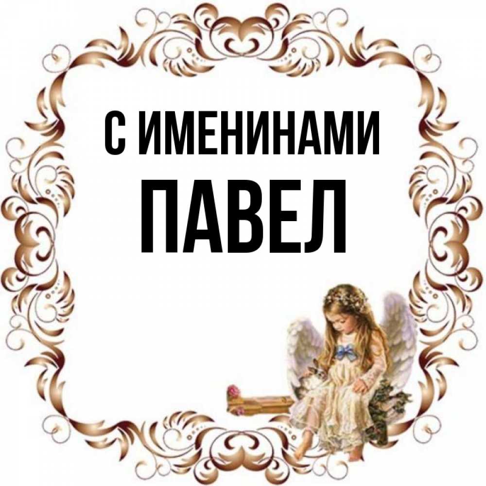 Открытка С именинами Павел. ангел сидит на рамочке . рамочка из перьев и ангелочек