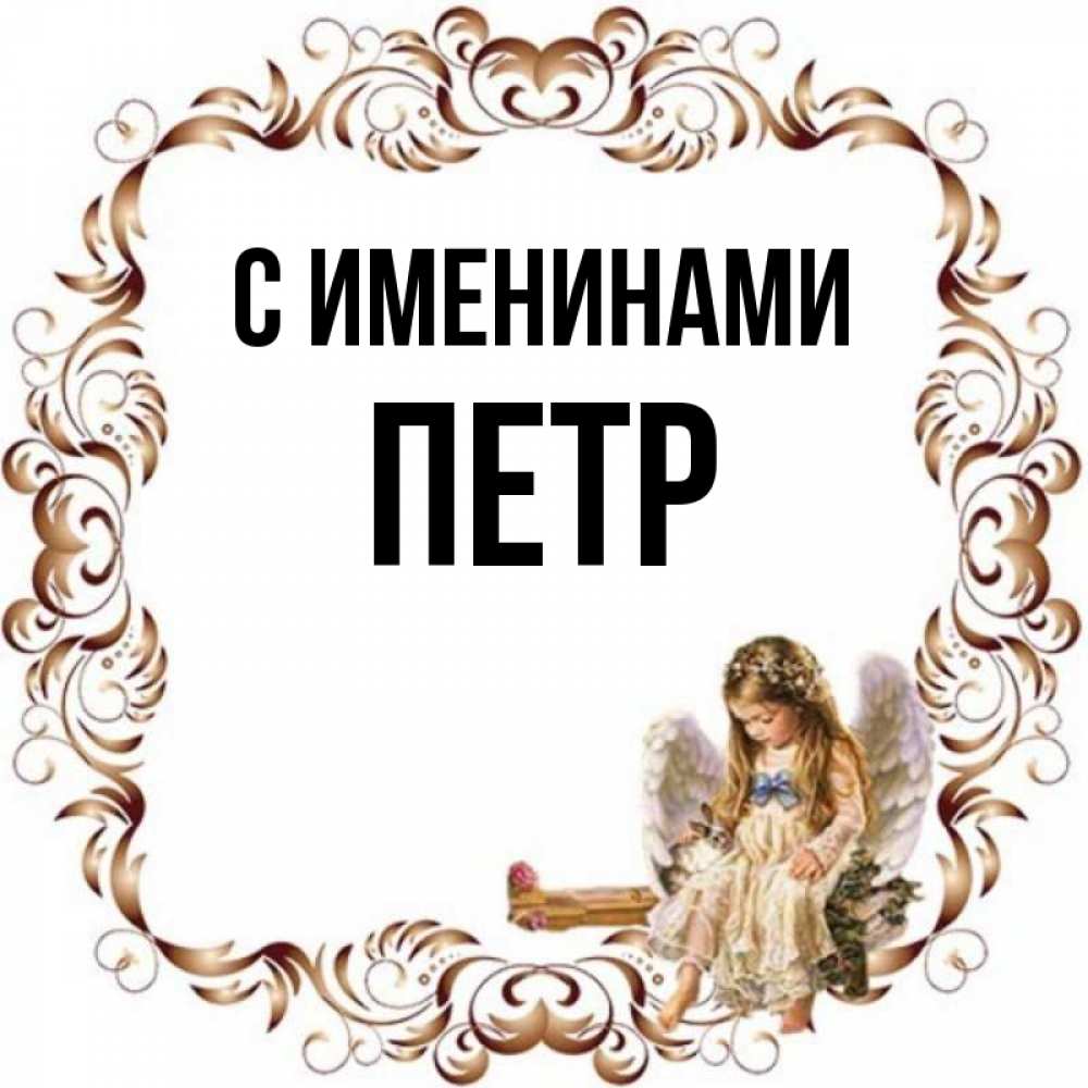 Открытка С именинами Петр. ангел сидит на рамочке . рамочка из перьев и ангелочек