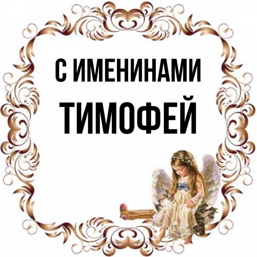 Открытка С именинами Тимофей. ангел сидит на рамочке . рамочка из перьев и ангелочек