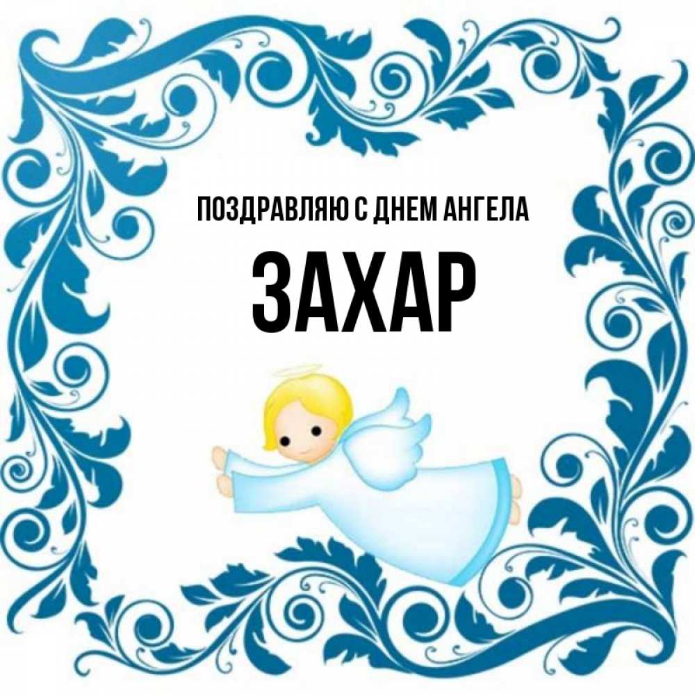 Открытка Поздравляю с днем Ангела Захар. летящий ангел в рамочке. девочка ангел и синяя рамка