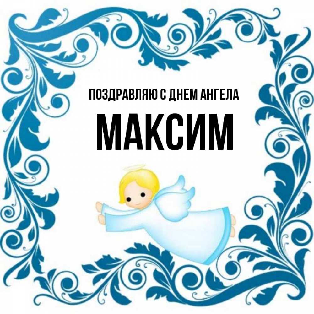 Открытка Поздравляю с днем Ангела Максим. летящий ангел в рамочке. девочка ангел и синяя рамка