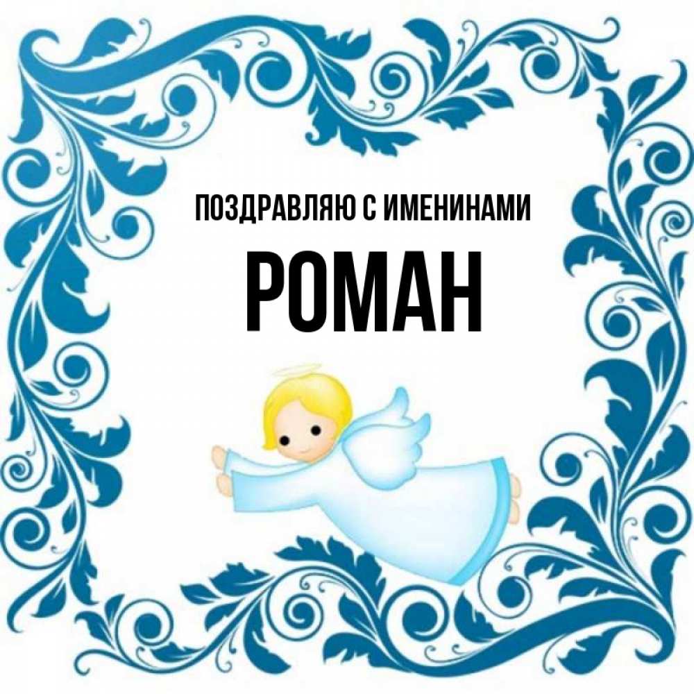 Открытка Поздравляю с именинами Роман. летящий ангел в рамочке. девочка ангел и синяя рамка