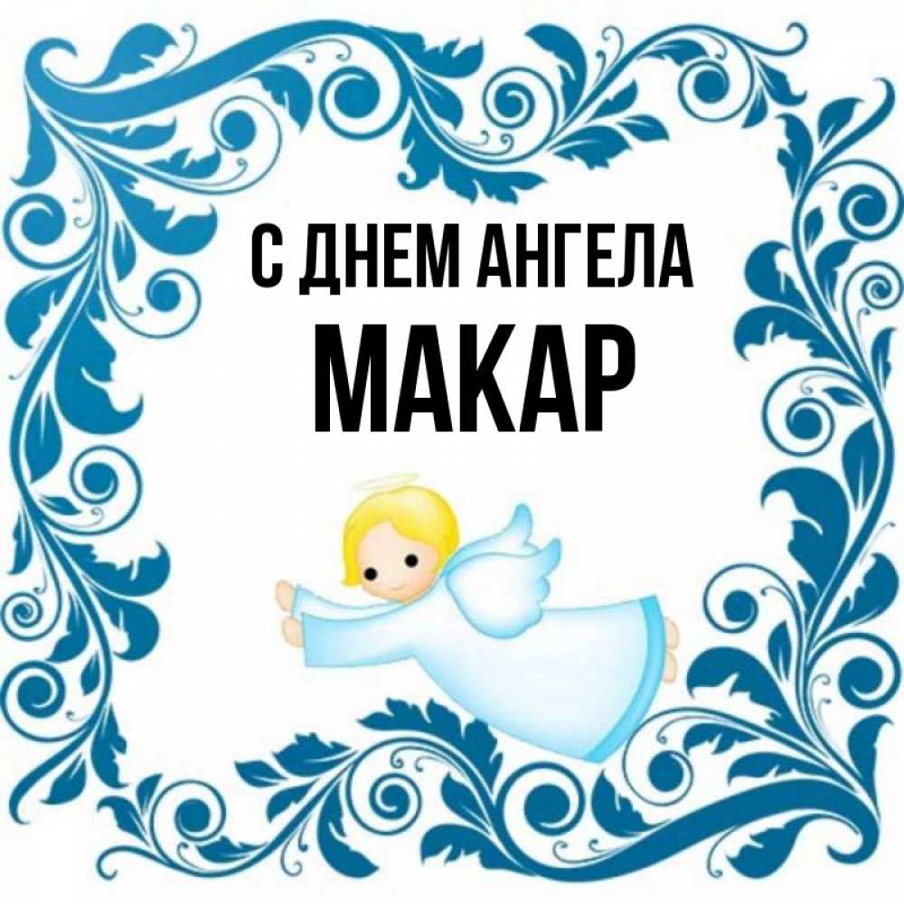 Открытка С днем Ангела Макар. летящий ангел в рамочке. девочка ангел и синяя рамка