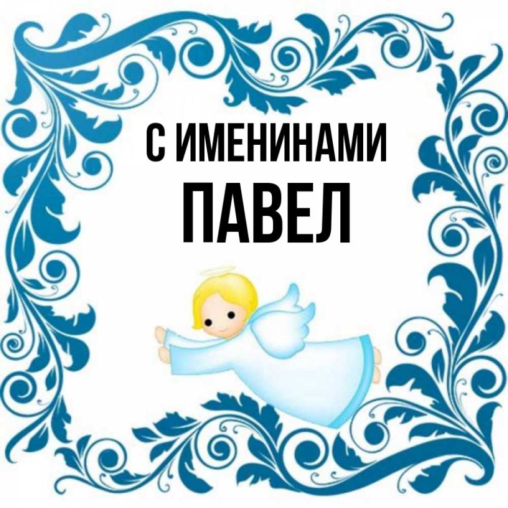 Открытка С именинами Павел. летящий ангел в рамочке. девочка ангел и синяя рамка