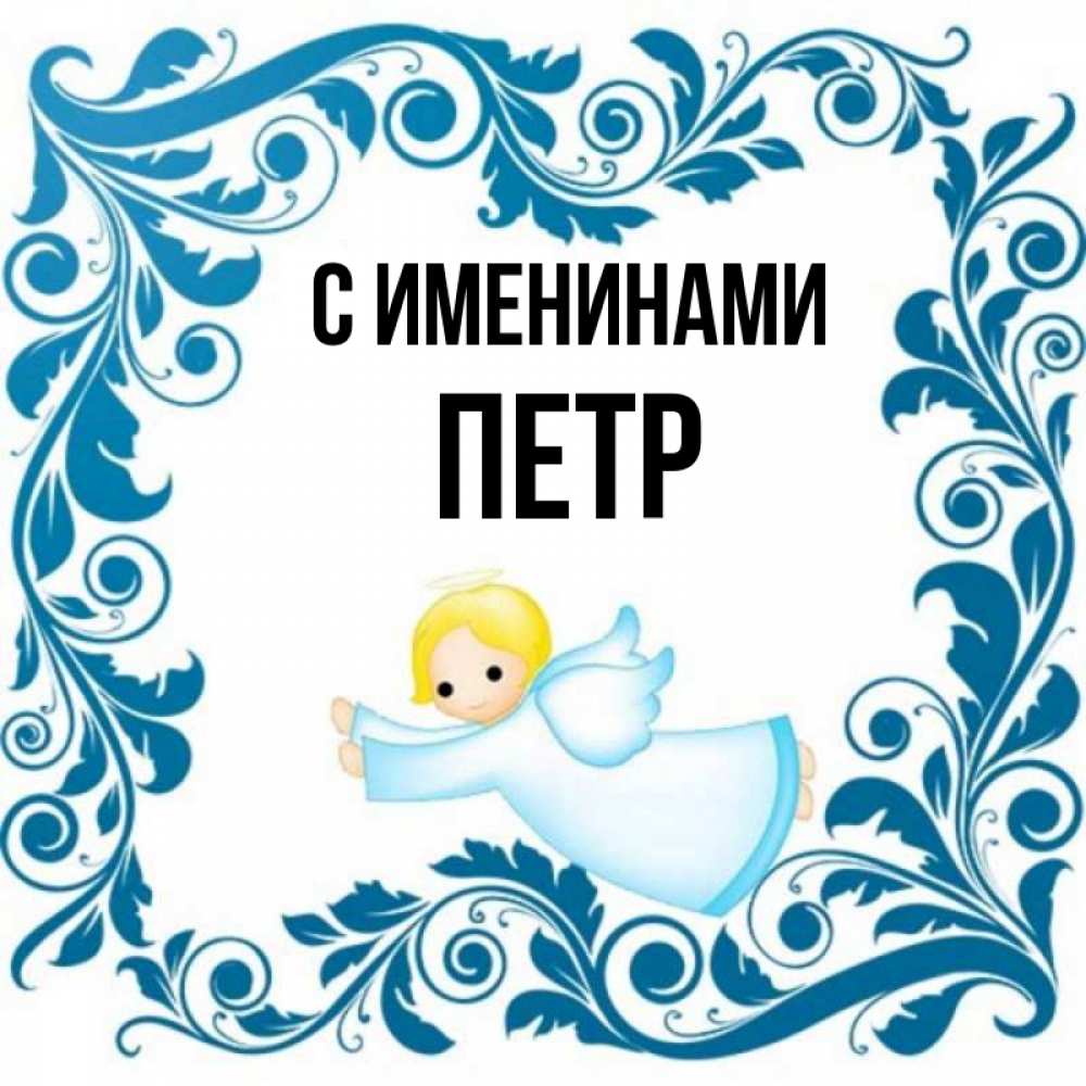 Открытка С именинами Петр. летящий ангел в рамочке. девочка ангел и синяя рамка
