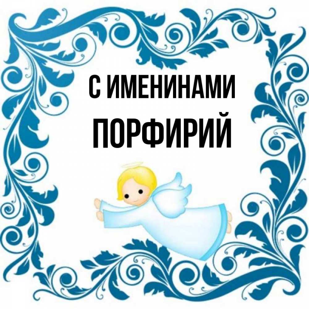 Открытка С именинами Порфирий. летящий ангел в рамочке. девочка ангел и синяя рамка